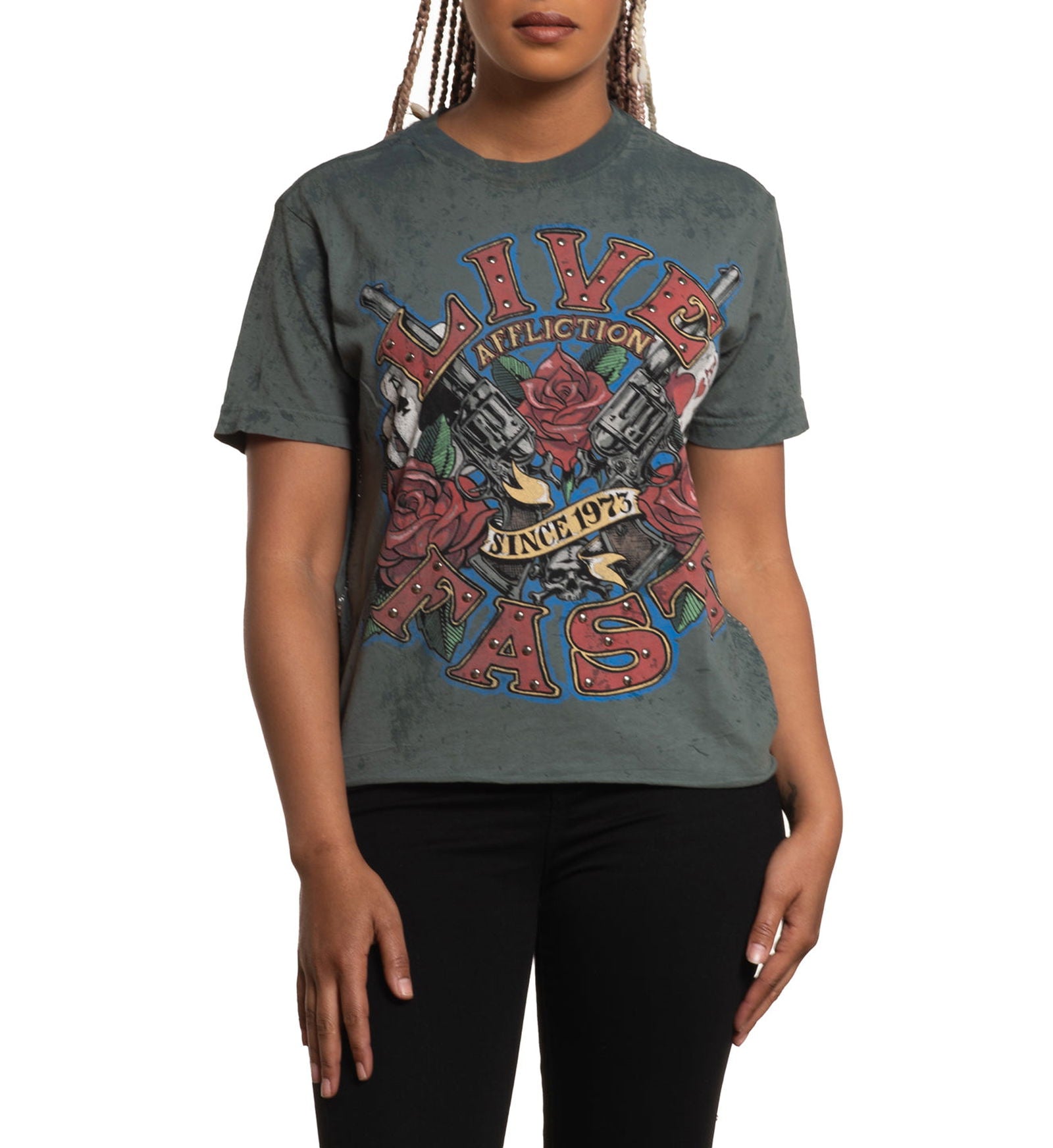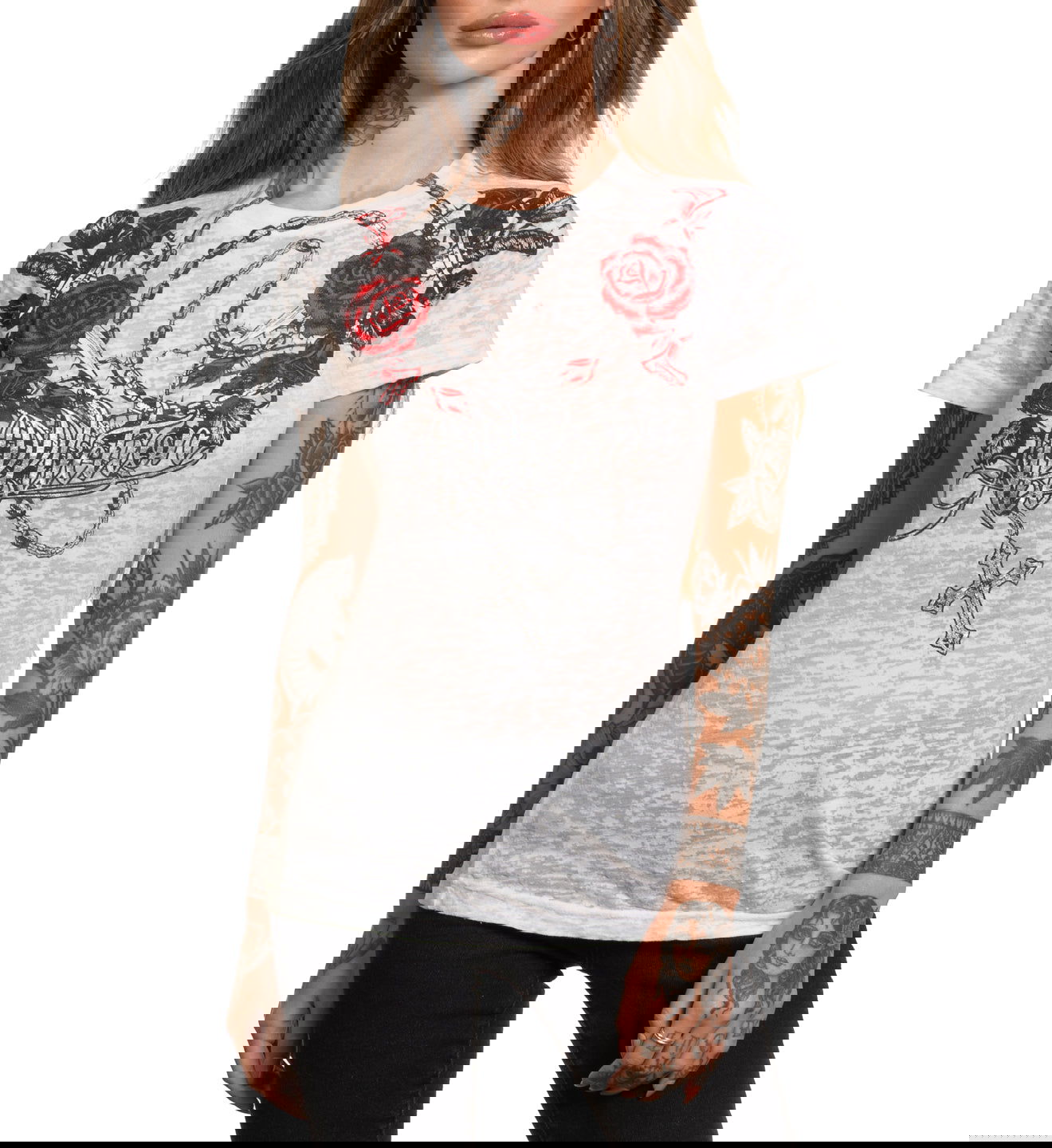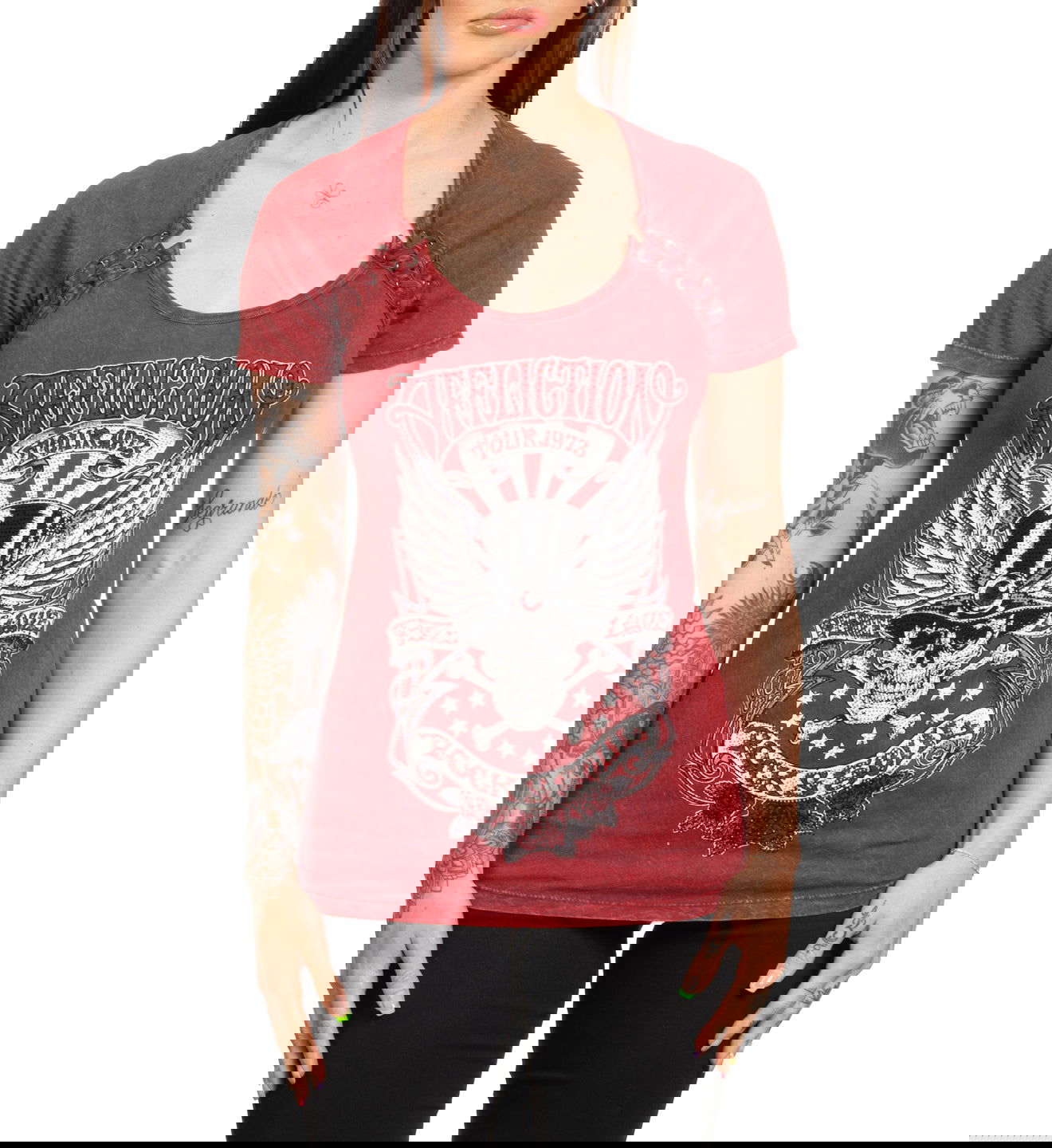 Short sleeve tees are a staple in any woman’s wardrobe, so look no further for your new favorites. Affliction’s range of short sleeve tees are made with high quality cotton, featuring original art, alternative washes, and detailed embellishments. Affliction’s short sleeve women’s tees are made for self expression - explore the collection to find the styles that resonate with you.